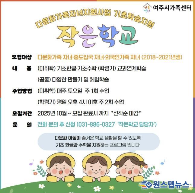 다문화가족자녀 기초학습지원사업 ‘작은학교’는 다문화 아동에게 한글과 수학 등 기초학습을 제공해 기초학력 향상과 학교생활 적응을 돕는 프로그램이다. 여주시가족센터는 2023년도부터 프로그램을 신규 운영해 현재까지 큰 호응을 얻고 있다. 2023년도에는 연 350회기, 총 1,284명이 참여, 2024년도에는 연 460회기 총 1,760명이 참여했다. 또한 기초학습 능력 향상과 사회성 향상 등 만족도 문항에 4.90점을 기록하는 등의 높은 성과를 보였다.