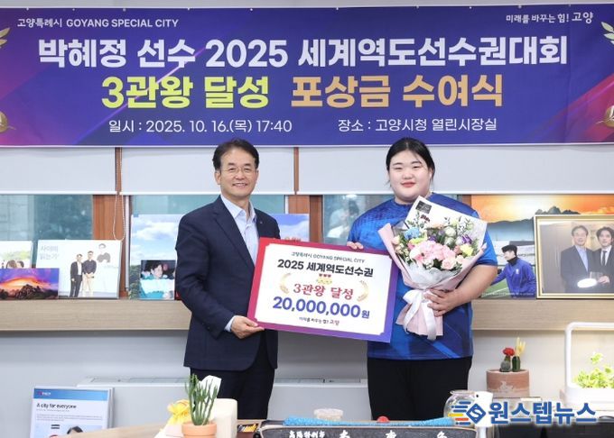 원스텝뉴스 이병희 기자 | 고양특례시가 지난 16일 ‘2025 국제역도연맹(IWF) 세계역도선수권대회’ 여자 86kg 이상급 3관왕에 오른 박혜정 선수에게 포상금을 수여하며 그간의 노고를 격려했다.