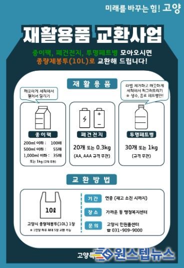 원스텝뉴스 이병희 기자 | 고양특례시가 2회 추가경정예산을 통해 2천만 원을 확보해 시민들의 호응 속에 추진 중인 재활용품 교환사업을 계속 이어간다.