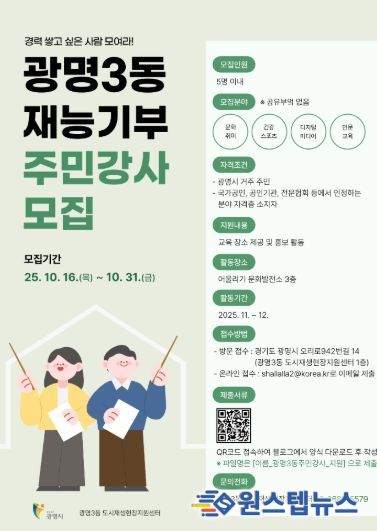 원스텝뉴스 이병희 기자 | 광명시는 주민 재능 나눔으로 지역 공동체 활력을 높이기 위해 광명3동 어울리기 문화발전소에서 교육 프로그램을 운영할 주민 강사를 모집한다고 17일 밝혔다.