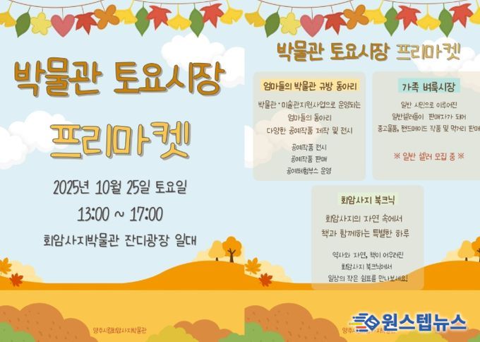원스텝뉴스 천규영 기자 | 양주시립회암사지박물관이 오는 25일 오후 1시부터 5시까지 가을을 맞아 “박물관 토요시장” 프리마켓을 운영한다.