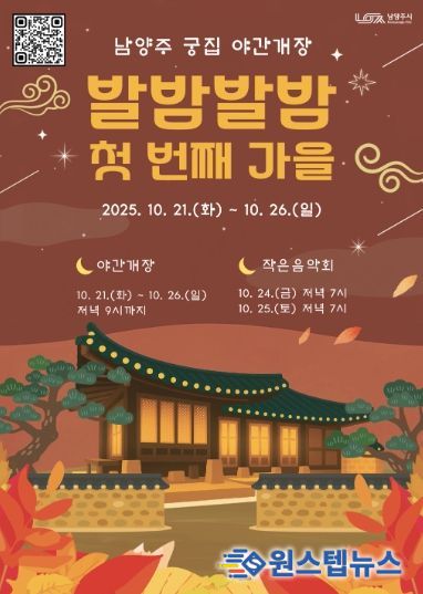 시 관계자는 “남양주 궁집은 고즈넉한 전통 건축미와 정취를 간직한 공간으로 이번 행사를 통해 관람객이 특별한 가을밤의 감성을 느낄 수 있을 것이라 기대한다”며 “앞으로도 남양주 궁집이 도심 속의 힐링 명소로 활용될 수 있도록 다양한 프로그램을 진행하겠다”고 말했다.
