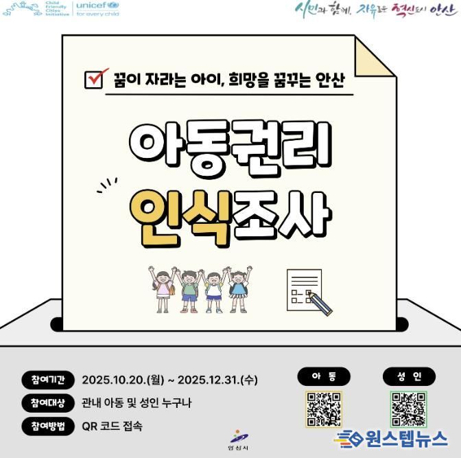 원스텝뉴스 이병희 기자 | 안산시는 오는 12월 31일까지 ‘2025년 안산시 아동권리 인식조사’를 실시한다고 20일 밝혔다.