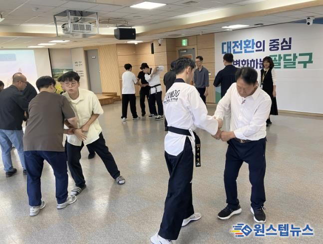 원스텝뉴스 이병희 기자 | 수원시 팔달구는 공공청사 내 각종 폭력 및 테러에 대응하기 위해 지난 17일 SOS팔달안전봉사단과 구·동 공직자를 대상으로 구청 대회의실에서 호신술 실습 등 범죄예방 교육을 실시했다.