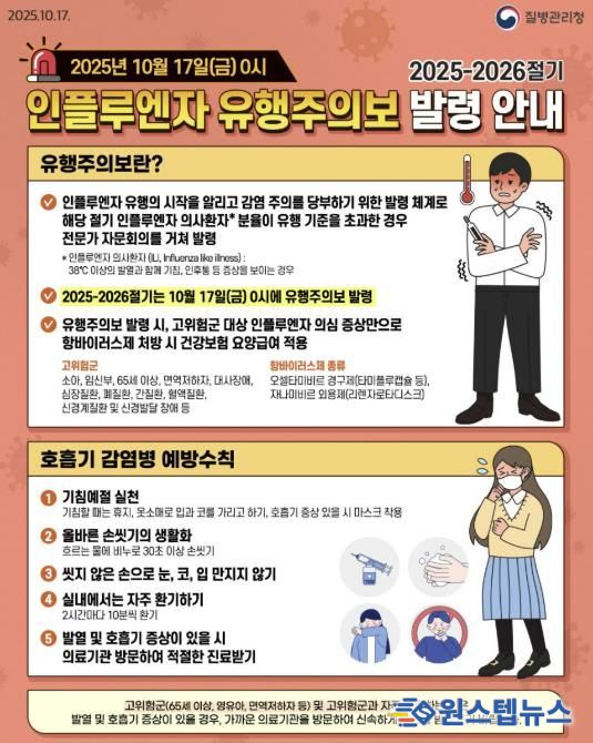 원스텝뉴스 이병희 기자 | 17일 질병관리청이 전국에 인플루엔자 유행주의보를 발령한 가운데, 안양시는 시민들에게 인플루엔자 예방접종과 개인 위생수칙 준수 독려에 나섰다.