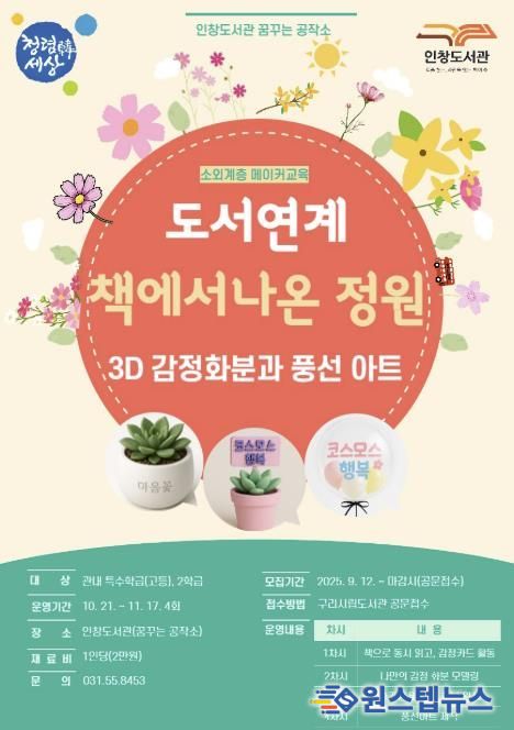 원스텝뉴스 이병희 기자 | 구리시 인창도서관의 메이커스페이스‘꿈꾸는 공작소’가 오는 10월 21일부터 11월 17일까지 총 4회에 걸쳐 특수학급 학생들을 대상으로 '책에서 나온 정원' 메이커 프로그램을 운영한다.