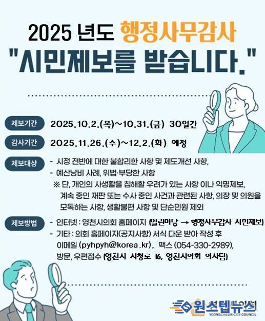 원스텝뉴스 이병희 기자 | 영천시의회는 2025년도 행정사무감사를 앞두고 10월 31일까지 시민제보를 받는다.
