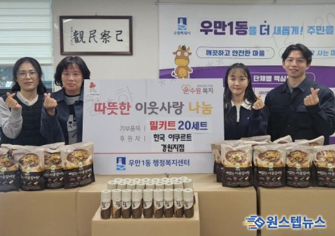 원스텝뉴스 이병희 기자 | 수원시 팔달구 우만1동 행정복지센터는 지난 20일, 한국야쿠르트 경원지점으로부터 갈비탕, 소불고기떡볶이, 발효유 등 다양한 즉석조리식품을 전달받았다. 이번 후원은 지역 내 어려운 이웃들에게 따뜻한 마음을 전하고자 마련된 것으로, 전달된 물품은 취약계층 가정에 소중히 전달될 예정이다.
