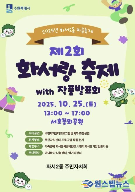이번 행사는 “화서2동 주민 모두 함께 즐기는 축제”를 주제로, 주민이 직접 참여하고 만드는 화합의 축제로 기획됐다. 주민자치센터 수강생들의 한 해 활동을 공유하는 작품발표회, 지역 동아리와 어린이들의 무대 공연, 주민이 함께 즐길 수 있는 체험 부스와 먹거리 장터 등 다채로운 프로그램이 마련된다.