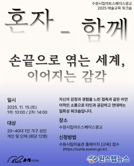 원스텝뉴스 천규영 기자 | 경기도 수원시립미술관은 예술을 통해 타인과의 관계를 확장하고 감각을 회복하는 예술교육 워크숍 '혼자-함께'를 11월 15일 수원시립아트스페이스광교에서 개최한다.