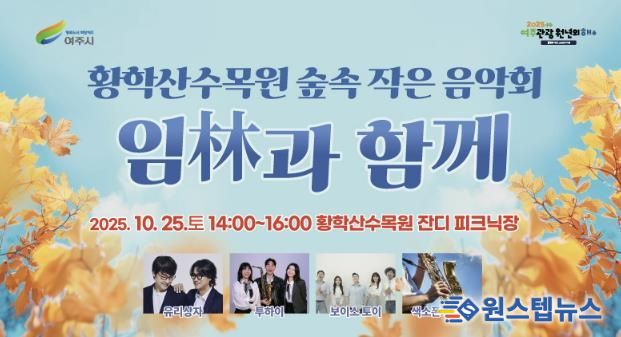 원스텝뉴스 천규영 기자 | 여주시는 오는 10월 25일 오후 2시부터 4시까지 황학산수목원 잔디피크닉장에서 ‘임(林)과 함께’ 음악회를 연다고 밝혔다.
