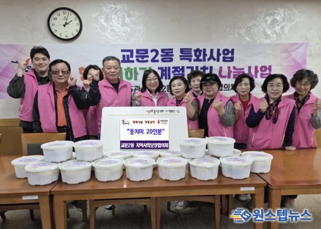 한편, ‘행복 더하기 계절 김치 나눔 사업’은 2023년부터 매년 이어지고 있는 교문2동 지역사회 보장협의체의 대표 복지 특화사업으로, 계절별로 맞춤형 김치를 담가 관내 취약계층에 전달해 큰 호응을 얻고 있다. 협의체는 올겨울에도‘겨울 계절 김치 나눔’을 추진해 지역 내 소외된 이웃들에게 따뜻한 마음을 전할 예정이다.