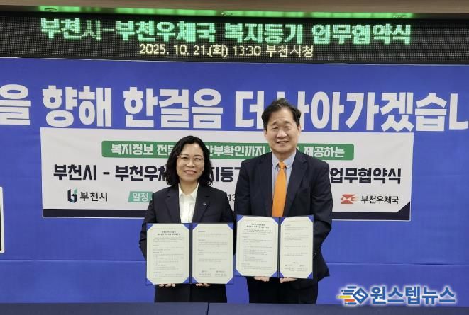 원스텝뉴스 이병희 기자 | 부천시는 지난 21일 부천우체국과 ‘복지등기 서비스 지원’을 위한 업무협약을 맺고, 우편배송망을 활용해 복지사각지대를 발굴하고 위기가구를 지원하는 공공협력 체계를 본격적으로 가동한다.