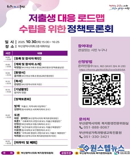 원스텝뉴스 이병희 기자 | 부산광역시의회 복지환경위원회 윤태한 위원장(사상구1, 국민의힘)은 2025년 10월 30일 15시 부산광역시의회 2층, 대회의실에서 ⌜저출생 대응 로드맵 수립을 위한 정책토론회⌟를 개최한다고 전했다.