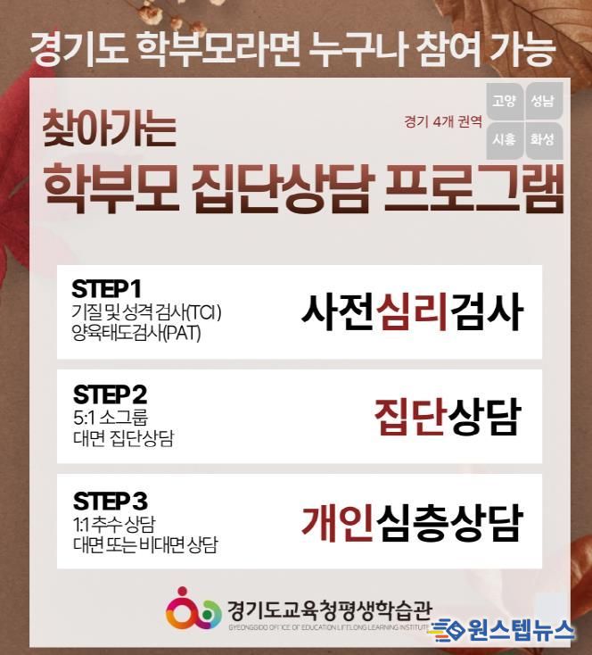 원스텝뉴스 이병희 기자 | 경기도교육청평생학습관 경기학부모지원센터가 자녀양육 과정에서 부모가 겪는 어려움과 고민을 함께 나누고 공감할 수 있도록 ‘찾아가는 학부모 집단상담 프로그램’을 운영한다.