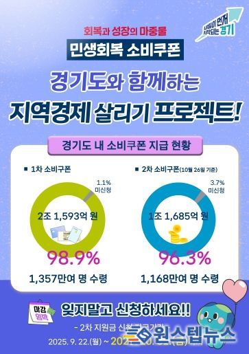 한편 경기도의 지난 1차 소비쿠폰의 지급률은 98.9%로 1,357만여 명이 소비쿠폰 2조 1,593억 원을 수령한 바 있으며, 26일 현재 1차와 2차를 거쳐 지급된 소비쿠폰(약 3조 3,275억 원)의 91.5%가 사용된 것으로 나타났다.