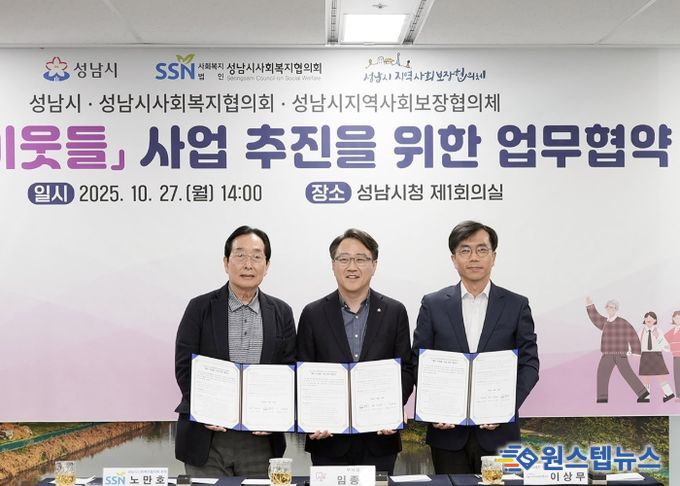 시는 10월 27일 오전 10시 시청 4층 제1회의실에서 임종철 성남시 부시장과 노만호 성남시사회복지협의회장, 이상무 성남시지역사회보장협의체 민간공동위원장 등이 참석한 가운데 ‘좋은 이웃들 사업 추진을 위한 업무협약’을 체결했다.