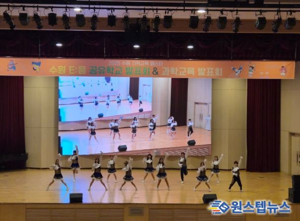 수원 E:음 공유학교 성장나눔 발표회에서는 학생기획형 프로그램 운영사례 발표와 함께 학생들이 직접 준비한 치어리딩·한국무용·밴드 공연이 진행되어 현장에 활기를 더했다.