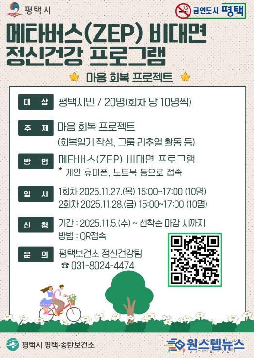 원스텝뉴스 이병희 기자 | 평택시는 시민들의 회복 탄력성 증진에 도움을 주고자 메타버스 플랫폼을 활용한 비대면 정신건강 프로그램 ‘마음 회복 프로젝트’를 운영한다.