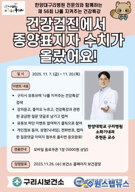 원스텝뉴스 이병희 기자 | 구리시는 시민의 암 예방과 건강관리 역량 강화를 위해, 오는 7일 한양대학교구리병원 소화기내과 주현돈 교수를 초청해 ‘건강검진에서 종양표지자 수치가 올랐어요!’를 주제로 한 건강특강을 구리시 공식 유튜브 채널 ‘구리비전’을 통해 송출한다.