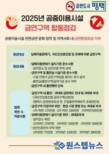 원스텝뉴스 이병희 기자 | 평택시는 오는 11월 5일부터 12월 17일까지 공중이용시설 내 금연 문화 정착과 금연 환경 조성을 위해 ‘2025년 하반기 공중이용시설 금연 합동 지도점검’을 실시한다.