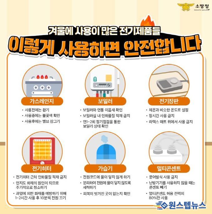 광명소방서는 이번 사례를 계기로 전기매트와 전기히터 등 난방기기 사용 시 반드시 지켜야 할 안전수칙을 강조했다. 주요 수칙으로는 ▲KC 인증 제품 사용 ▲라텍스 제품과 병행 사용 금지 ▲외출 시 전원 차단 ▲전원 코드 상태 점검 등이 있으며, 화재 징후가 발견될 경우 즉시 사용을 중단하고 119에 신고해야 한다고 당부했다.