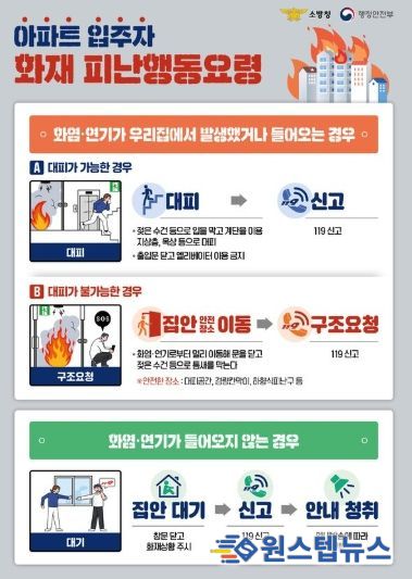 이처럼 침착하게 대피공간으로 피신해 구조를 기다린 사례는 매우 적절한 대응으로, 실제 화재 상황에서는 무작정 탈출하기보다 상황에 맞는 판단이 무엇보다 중요하다. 이에 따라 예전에는 공동주택 화재 시 대피 요령으로 “불나면 대피 먼저”를 강조했지만, 최근에는 “불나면 살펴서 대피”로 지침이 바뀌었다. 복도나 계단에 불길이나 연기가 가득할 경우에는 문을 닫고 대피공간, 경량칸막이, 하향식 피난구 등 피난 시설을 활용해 실내에서 구조를 기다리는 것이 더 안전할 수 있다.