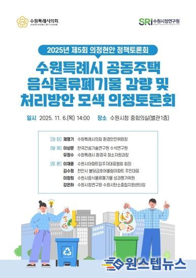원스텝뉴스 이병희 기자 | 수원특례시의회 환경안전위원회는 11월 6일, 오후 2시, 수원시청 별관 1층 중회의실에서 ‘공동주택 음식물류폐기물 감량 및 처리방안 모색을 위한 의정토론회’를 개최한다고 밝혔다.