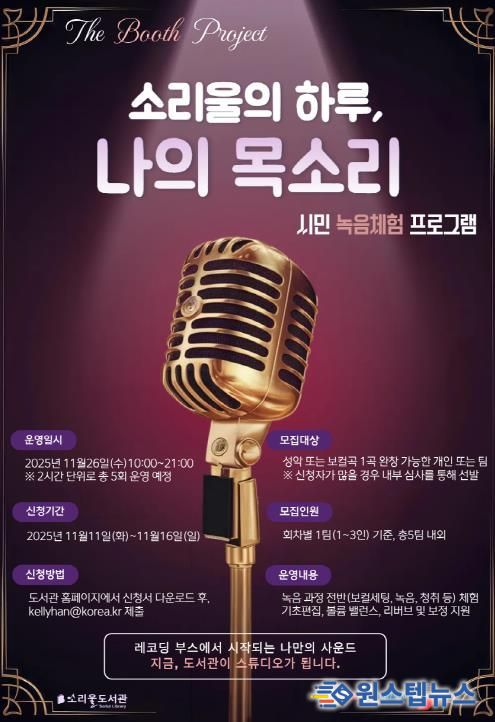 이번 프로그램은 시민들이 전문 장비와 시스템을 갖춘 소리울도서관 레코딩 부스에서 보컬 세팅, 녹음, 청취 등 전 과정을 직접 경험하며 자신의 목소리로 한 곡을 완성해보는 체험형 프로젝트다. 참가자는 녹음 후 기초 편집, 볼륨 밸런스, 리버브 등 간단한 후반 작업도 지원받을 수 있다.