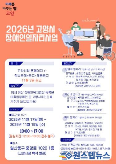 원스텝뉴스 이병희 기자 | 고양특례시는 장애인들이 사회에 참여하고 경제적으로 자립할 수 있는 기회를 확대하기 위해 ‘2026년 장애인 일자리 참여자’를 모집한다고 4일 밝혔다.