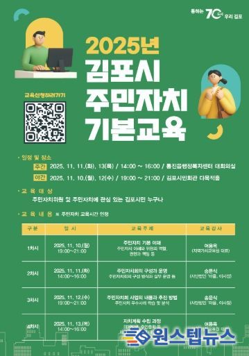 원스텝뉴스 이병희 기자 | 김포시는 주민자치위원 및 주민자치에 관심 있는 시민을 대상으로 '2025년 김포시 주민자치 기본 교육'을 오는 11월 10일부터 13일까지 운영한다고 밝혔다.