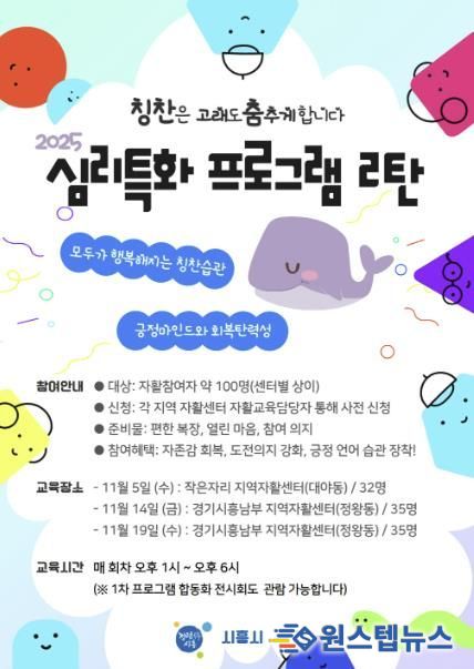 원스텝뉴스 이병희 기자 | 시흥시는 자활참여자의 정서적 역량 강화를 위해 지난 11월 5일 ‘2025년 자활참여자 심리특화 프로그램 2탄’을 대야동과 정왕동에서 진행했다. 이번 프로그램은 센터별 찾아가는 워크숍 방식으로 운영돼, 참여자들이 일상에서도 쉽게 참여하고 스스로 성장할 기회를 제공한다.