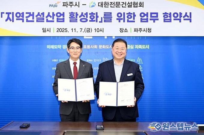 원스텝뉴스 이병희 기자 | 파주시와 대한전문건설협회 경기도회 파주시운영위원회는 지역 건설산업 활성화를 위한 상생 업무협약을 체결하고, 관내 건설 경기 부양을 위해 적극 협력하기로 뜻을 모았다.