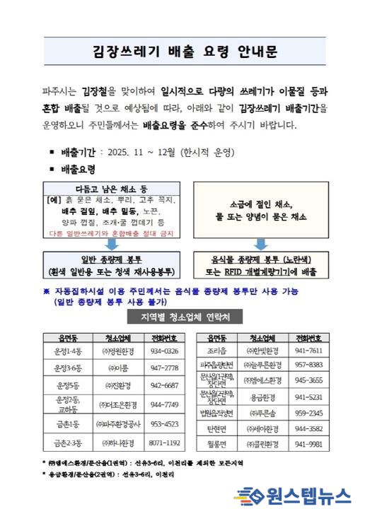 원스텝뉴스 이병희 기자 | 파주시는 동절기 김장철을 맞아 김장 쓰레기의 원활한 배출과 처리를 위해 11월부터 12월까지 ‘김장 쓰레기 특별 수거 기간’을 운영한다고 밝혔다.