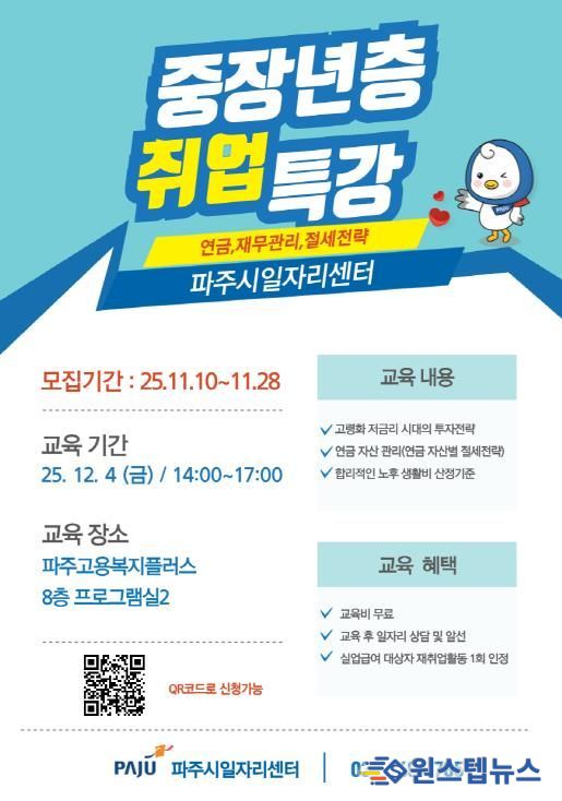 원스텝뉴스 이병희 기자 | 파주시는 오는 11월 10일부터 28일까지 ‘중장년층 취업 특강’에 참여할 교육생 15명을 선착순으로 모집한다.