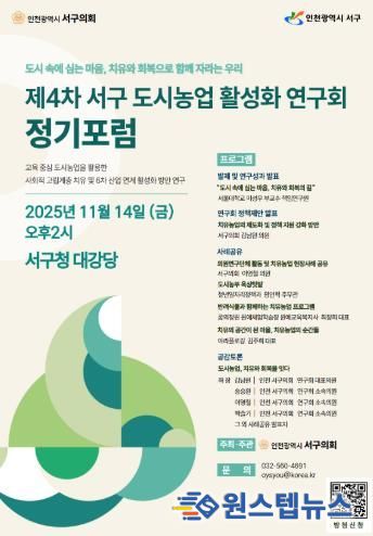 원스텝뉴스 이병희 기자 | 인천 서구의회 《서구 도시농업 활성화 연구회》는 14일 오후 2시, 서구청 대회의장에서 제4차 정기포럼을 개최한다.