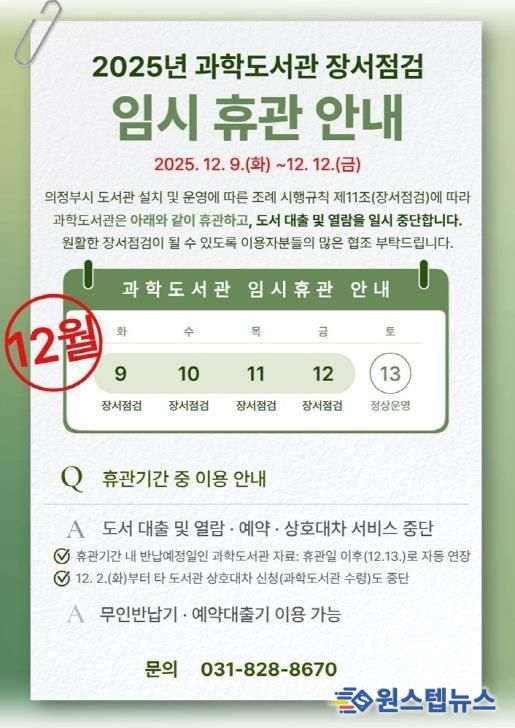 원스텝뉴스 이병희 기자 | 의정부과학도서관은 소장 자료의 상태와 보유 현황을 체계적으로 점검하기 위해 12월 9일부터 12일까지 4일간 임시 휴관한다.