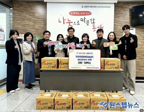 원스텝뉴스 이병희 기자 | 남양주시는 지난 7일 와부읍 우림루미아트아파트 입주자대표회의(회장 이추우)가 지역 내 어려운 이웃을 위해 라면 10박스를 남부희망케어센터에 기탁했다고 10일 밝혔다.