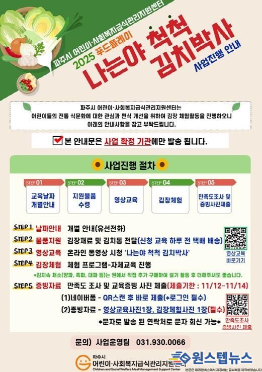원스텝뉴스 이병희 기자 | 파주시 위탁기관인 파주시 어린이·사회복지급식관리지원센터는 오는 12일부터 14일까지 관내 어린이 급식소를 대상으로 전통 김장 문화를 배우고 직접 체험하는 활동 ‘나는야 척척 김치 박사’를 운영한다고 밝혔다.