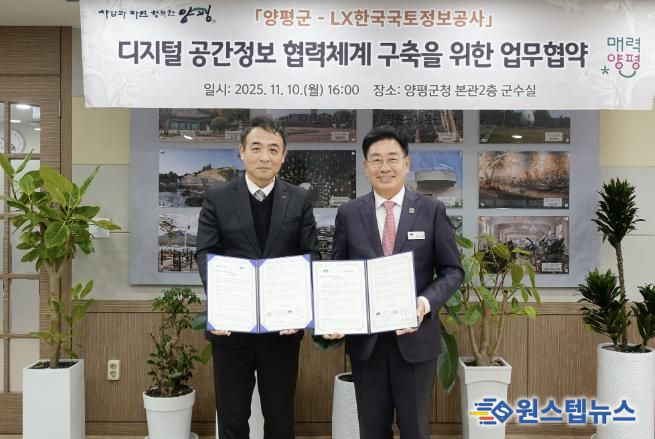 원스텝뉴스 이병희 기자 | 양평군은 지난 10일 LX한국국토정보공사와 ‘디지털 공간 정보 협력체계 구축을 위한 업무협약(MOU)’을 체결하고, 군민이 체감할 수 있는 스마트 행정 서비스 확대에 나섰다.
