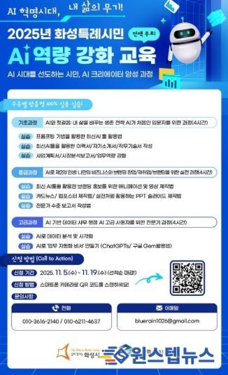 원스텝뉴스 이병희 기자 | 화성특례시가 기존의 이론 중심 인공지능(AI) 리터러시 교육을 한 단계 발전시킨 실습 중심의 ‘2025 화성특례시민 AI 교육 특강’을 운영한다고 11일 밝혔다.