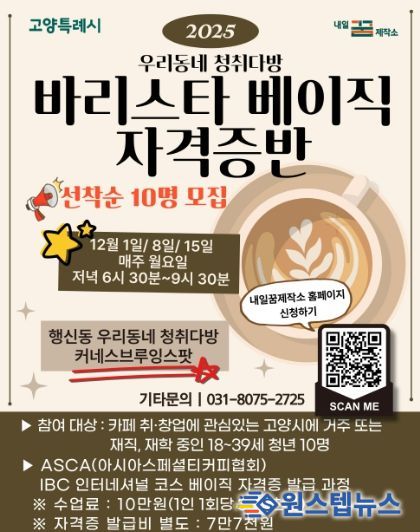 원스텝뉴스 이병희 기자 | 고양특례시가 고양시에 거주하거나 활동(재학, 재직)하는 청년들을 대상으로 카페 취·창업에 적용할 수 있는 ‘바리스타 베이직 자격증반’을 운영한다.