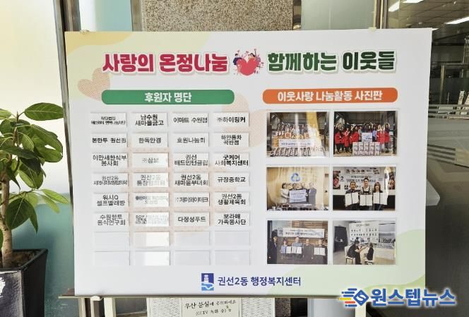 원스텝뉴스 이병희 기자 | 수원시 권선구 권선2동 행정복지센터는 지난 11일, 권선2동 후원자들을 위한 “함께하는 이웃, 사랑의 온정나눔” 게시판을 제작·설치했다고 밝혔다.