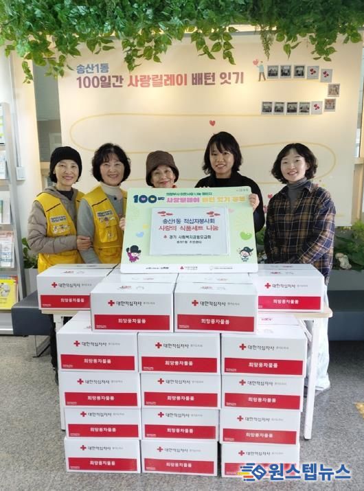 원스텝뉴스 이병희 기자 | 의정부시 송산1동주민센터는 11월 11일 대한적십자사 송산1동 적십자봉사회가 ‘100일간 사랑릴레이 배턴 잇기’의 일환으로 식품세트 18개를 기탁했다고 밝혔다.