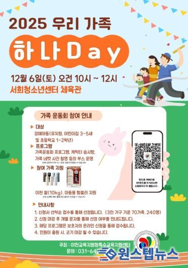 원스텝뉴스 이병희 기자 | 이천교육지원청 특수교육지원센터는 오는 12월 6일 서희청소년센터 체육관에서 ‘2025 장애아동 가족운동회 우리 가족 하나 Day’를 개최한다.