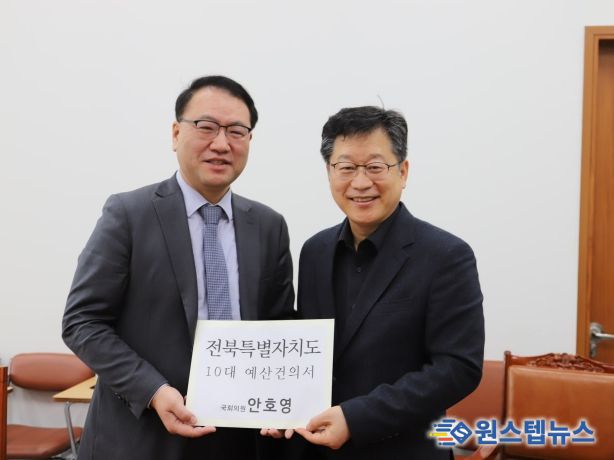원스텝뉴스 이병희 기자 | 국회 기후에너지환경노동위원회 안호영 위원장은 11월 11일 국회에서 유병서 기획재정부 예산실장을 만나 2026년도 전북 주요 예산사업 반영을 건의하고 건의서를 전달했다.