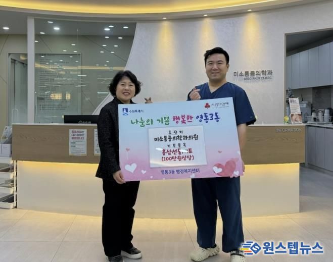 이강여 영통3동장은 “지역사회 발전과 복지증진을 위해 기여해준 미소통증의학과의 뜻깊은 나눔에 감사하다. 기탁된 물품이 필요한 가정에 소중히 전달되어 이웃들에게 따뜻한 온기로 전해지길 바란다”고 말했다.