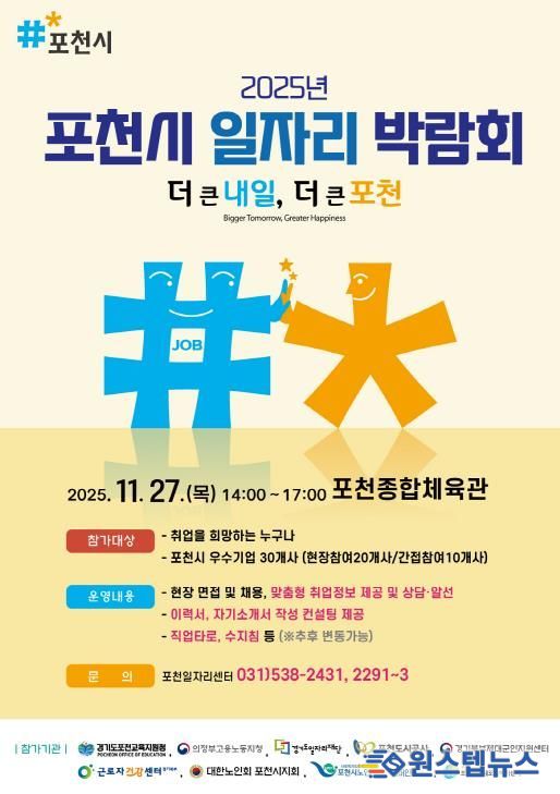 원스텝뉴스 이병희 기자 | 포천시는 오는 27일 포천종합체육관에서 지역의 구인난 해소와 구직자의 취업 기회 확대를 위한 ‘2025년 포천시 일자리 박람회’를 개최한다.