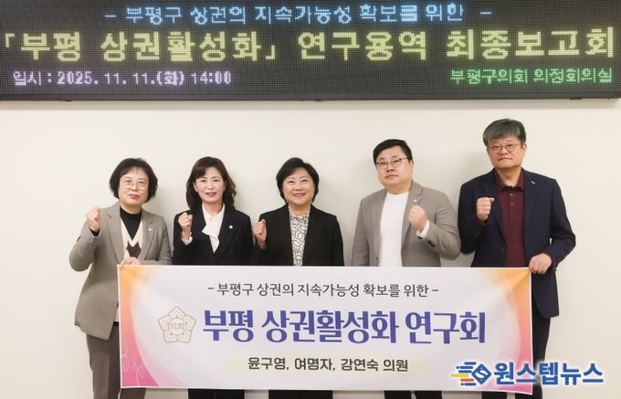 원스텝뉴스 이병희 기자 | 인천 부평구의회 의원연구단체인 “부평 상권활성화 연구회(대표의원 윤구영)”는 지난 11일 부평구의회 의정회의실에서 부평 상권활성화를 주제로 하는 연구용역 최종결과를 보고 받았다.
