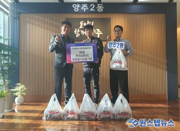 원스텝뉴스 이병희 기자 | 양주2동(동장 백기철)이 처갓집양념치킨 경기북부·체인본부 서석준 차장으로부터 관내 어려운 이웃에게 전달될 치킨 6마리를 매월 기부받는다.